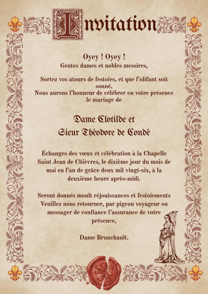 Pour participer au mariage, écrivez à Dame Brunehault à partir du 14 janvier 2026. Avant cette date, les demandes d’invitation ne seront pas prises en compte !